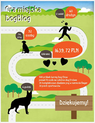 92 osoby i 74 psy w psiej grze miejskiej, 1639 zł i 72 gr zebrane dla schroniska w Józefowie, pół tysiąca rozdanych próbek karmy Dog Chow i ponad 70 osób na szkółce frisbee, 34 kompleksowo zbadane psy w namiocie Bayera, 30 psich sportowców, którzy zaprezentowali się na torze agility – to w sumie daje sześć godzin wspaniałej, wspólnej zabawy.